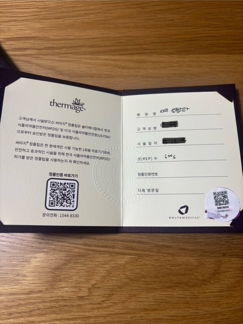 サーマクールFLX「サーマージ(Thermage)」の施術を受けると写真のカードのように紫色の正品認証書をもらえます。正品ではないと効果が期待できませんので必ず確認するようにします。